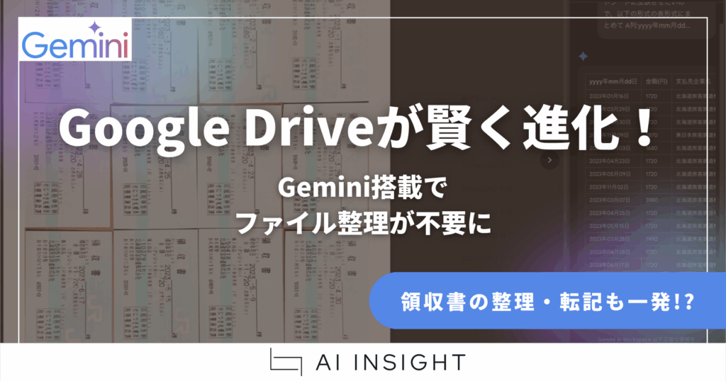 Google Driveが賢く進化!Gemini搭載でファイル整理が不要に 本記事を10秒でまとめると Google DriveにGeminiが直接統合! Drive上でファイルを開くだけで、Geminiが自動で要約やデータ化を実行。面倒な領収書の整理・転記も一瞬で完了。Geminiがファイル... -
