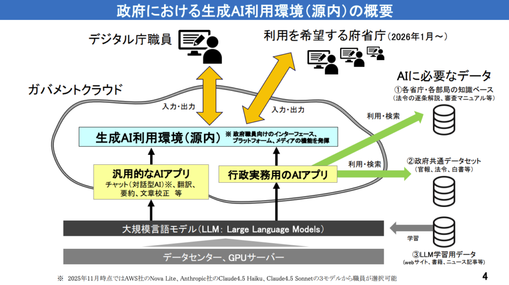 また、政府は今後国産大規模言語モデル(LLM)の試用も進める予定とのことで、源内で実際に利用し、行政業務に適したAIモデルを評価する方針です。