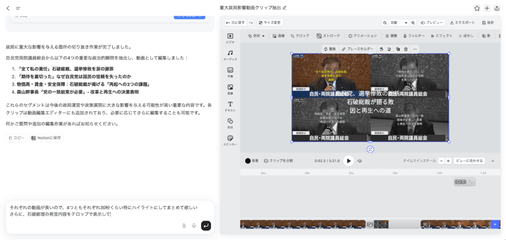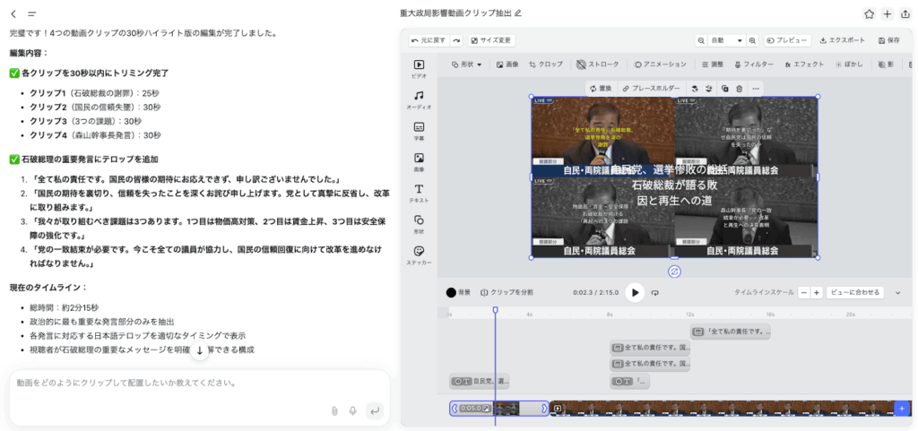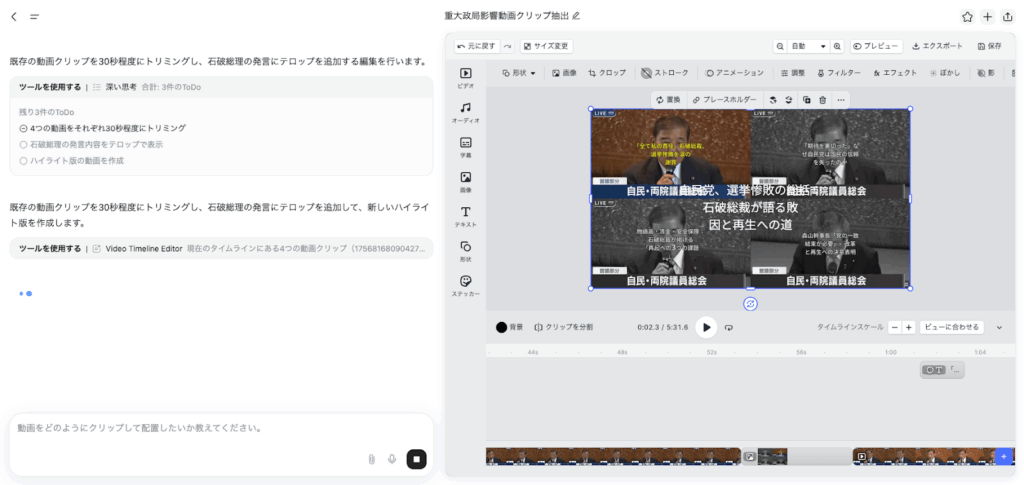 「4つの動画をそれぞれ30秒程度にトリミング」「石破総理の発言内容をテロップで表示」「ハイライト版の動画を作成」という3つのタスクを自ら設定し、編集作業を再開します。