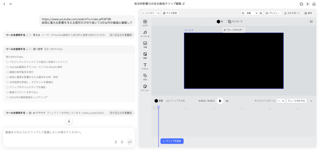 「YouTube動画をダウンロードしてAI-Driveに保存」「動画の音声転写を実行」「政局に重要な影響を与える箇所を分析・特定」など、人間が行うであろう作業工程をGensparkが自動でリストアップし、実行していく様子が分かります。まさにAIアシスタントが隣にいるかのようです。