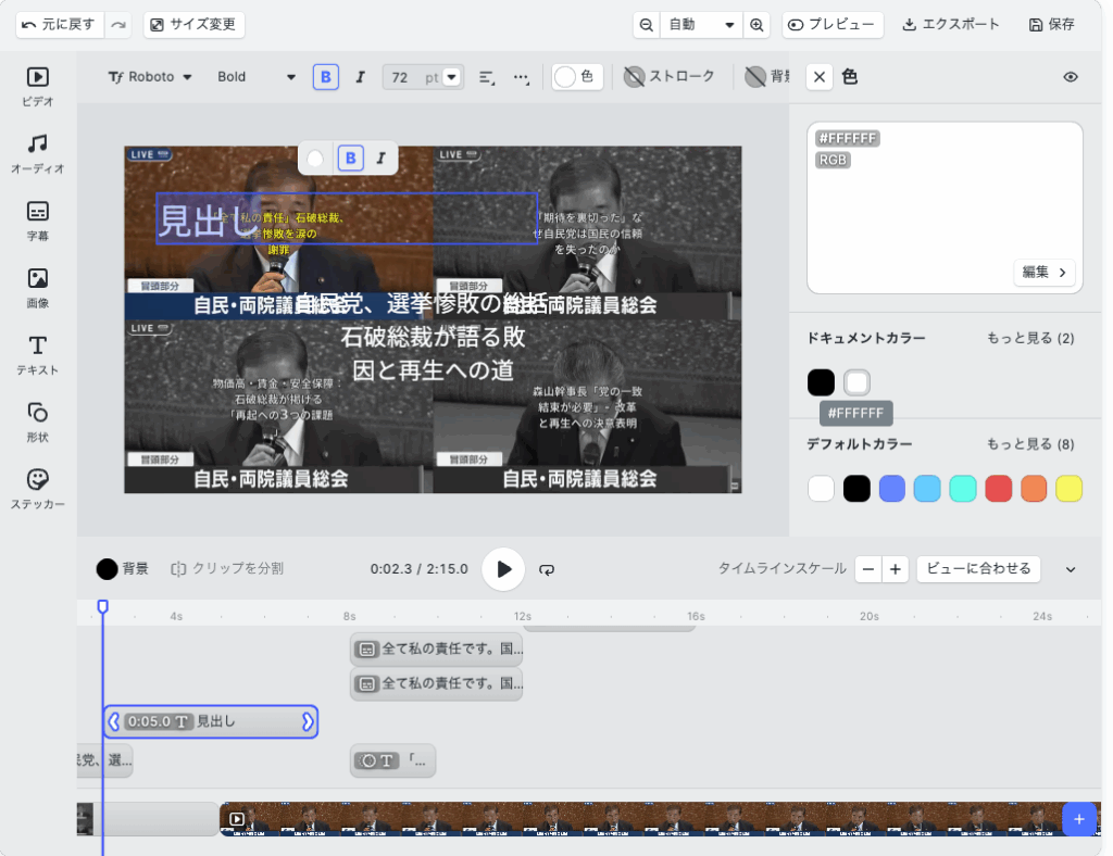 例えば、テロップの編集画面です。Gensparkが自動生成したテロップに対し、フォントの種類やサイズ、色、背景などを自由自在に変更できます。直感的な操作で、動画のトンマナに合わせたデザインに仕上げることが可能です。