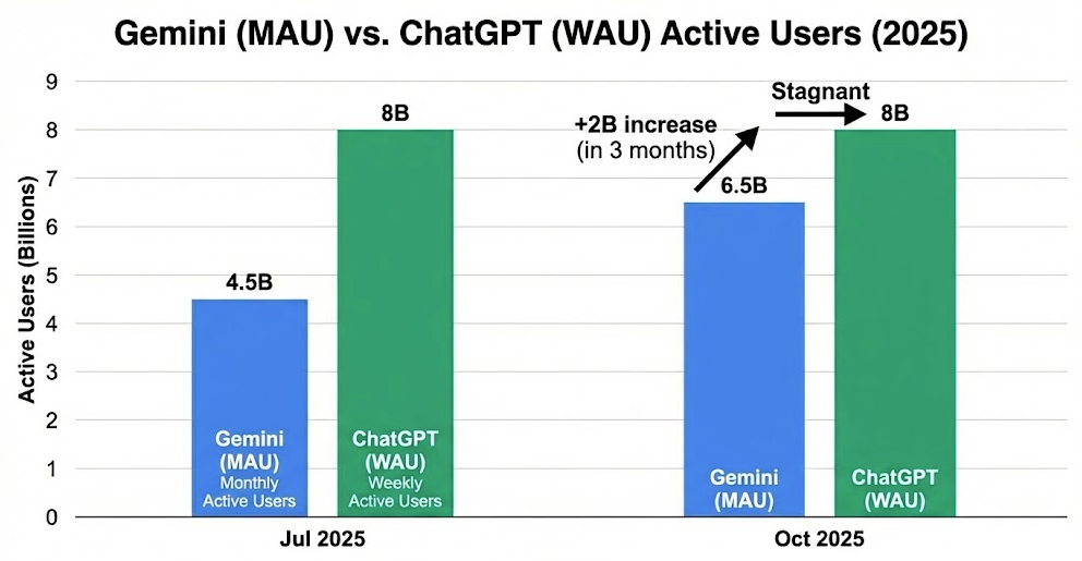 さらに衝撃的だったのは、ユーザーの動きです。Geminiアプリの月間アクティブユーザーは6.5億人(2025年10月時点)に達し、ChatGPTの週間8億人(月換算で約30億人)に急速に迫っています。