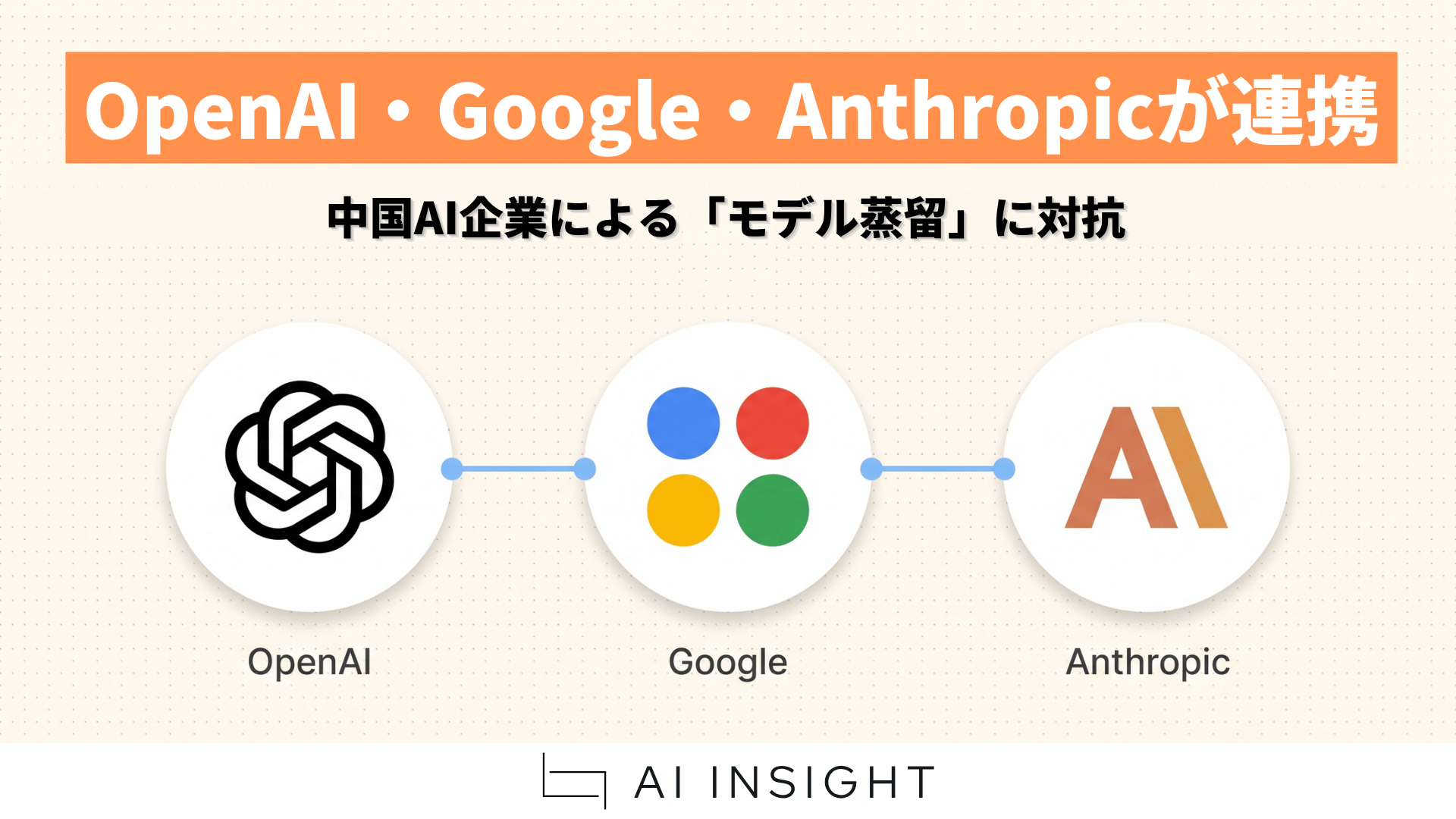 OpenAI、Google、Anthropicの3社が、中国AI企業によるモデル模倣への対抗として連携を開始した。問題視されているのは「蒸留(distillation)」と呼ばれる手法で、他社AIの出力を大量に取得して新しいモデルの学習に利用する方法である。米AI企業は情報共有などを通じて不正アクセスや能力抽出の検知を強化する方針だ。