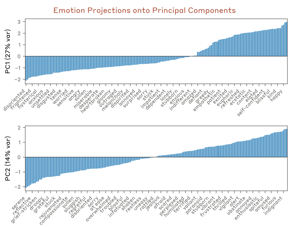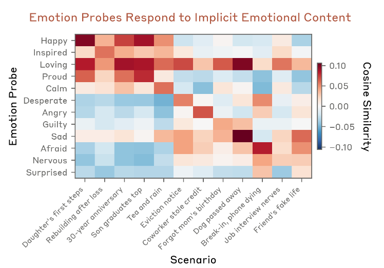 そのうえで、「特定の感情を経験するキャラクターの物語」を大量に生成させ、モデル内部の活性パターンを分析することで感情ごとのベクトルを抽出しています。