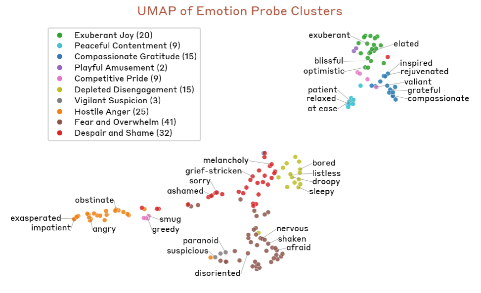 研究チームはClaude Sonnet 4.5の内部状態を解析し、emotion vectors(感情ベクトル)と呼ばれる表現を抽出しました。これは簡単に言うと「喜び」「怒り」「恐怖」「絶望」などの感情概念に対応する内部ベクトルです。