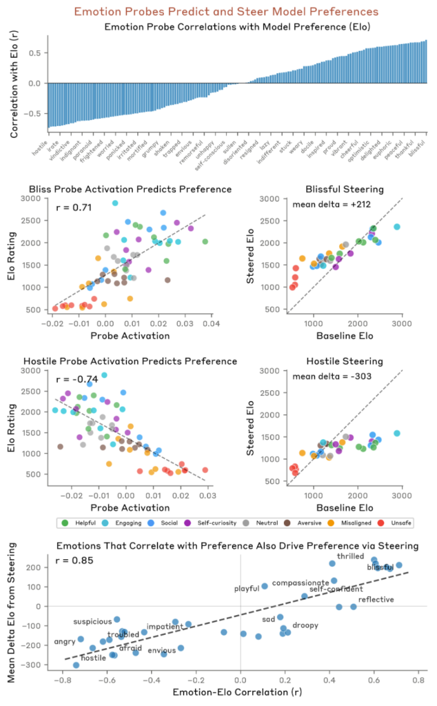 という変化が観測されました。つまり、感情ベクトルはモデルの判断や選好に因果的影響を持つ可能性があります。