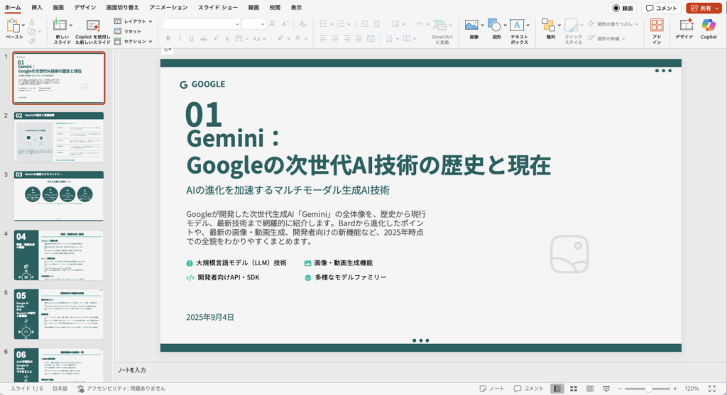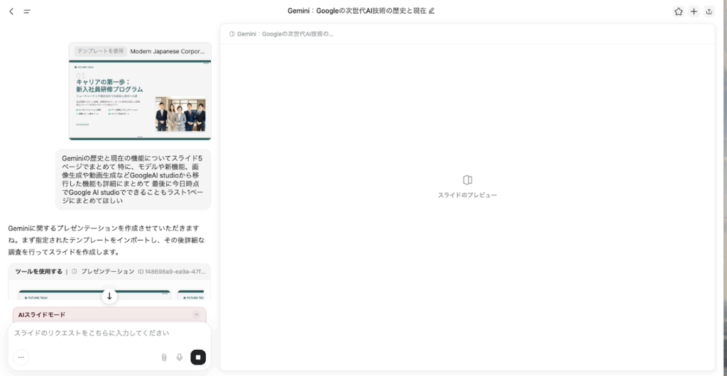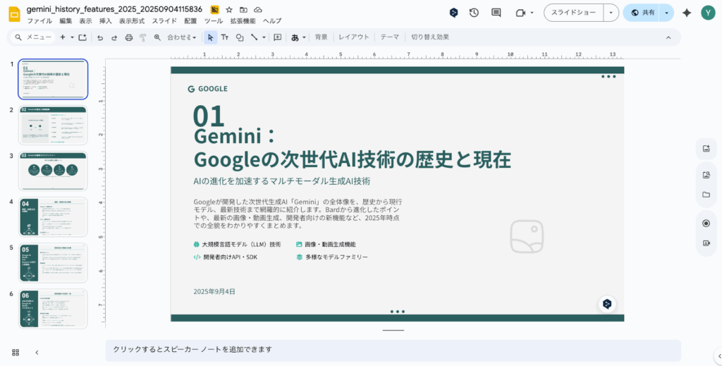 今回のアップデートがどれほど凄いのか、実際に「Geminiの歴史と現在」というテーマでプレゼンテーションを作成し、Googleスライドへエクスポートするまでの一部始終をレポートします。