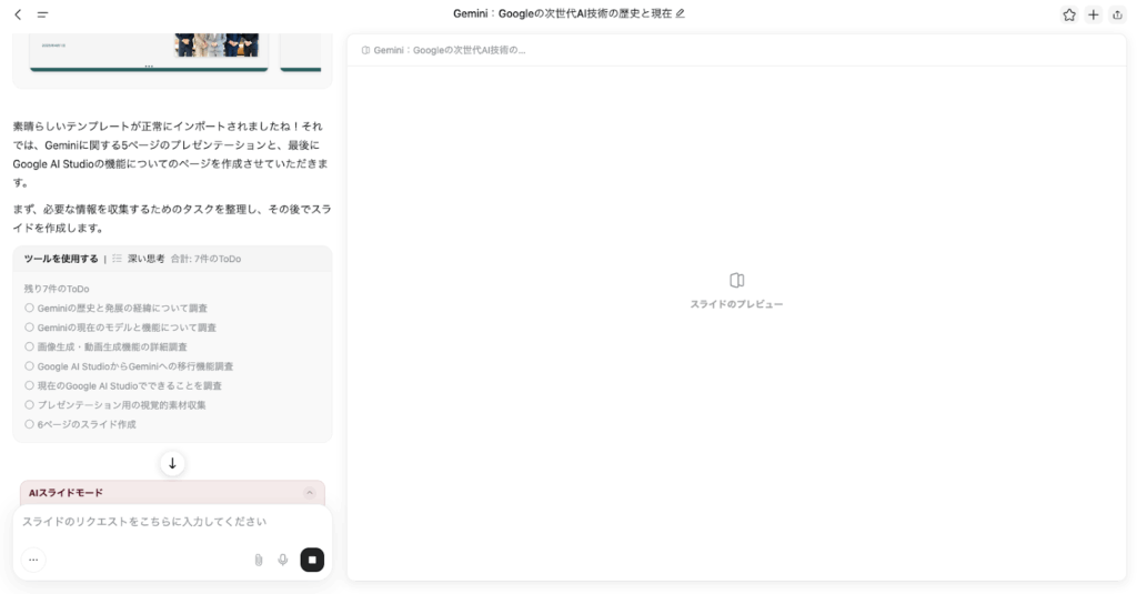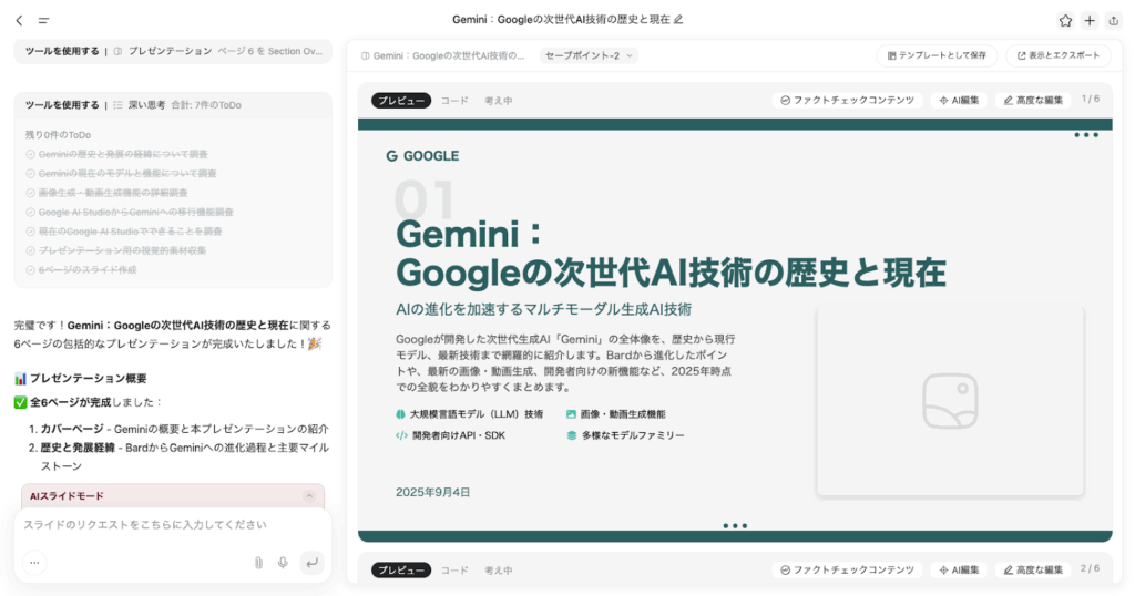指示を出すと、Gensparkは即座にプレゼンテーション作成に必要なタスクを自ら考え、ToDoリストを作成します。「Geminiの歴史と発展の経緯について調査」「現在のモデルと機能について調査」など、人間が資料を作る際に行うであろうリサーチ項目を自動でリストアップし、実行を開始します。