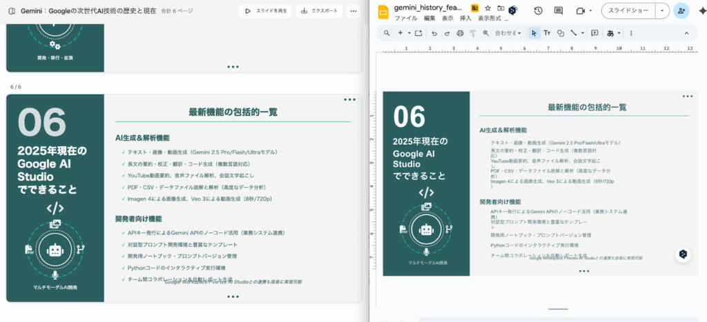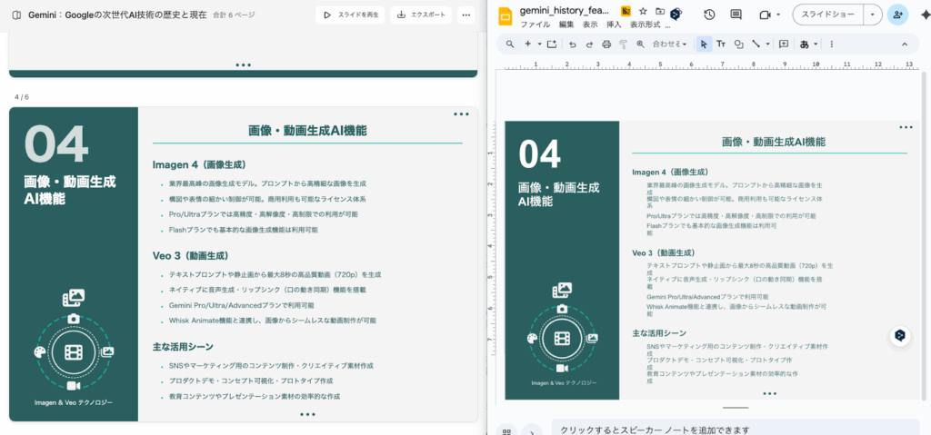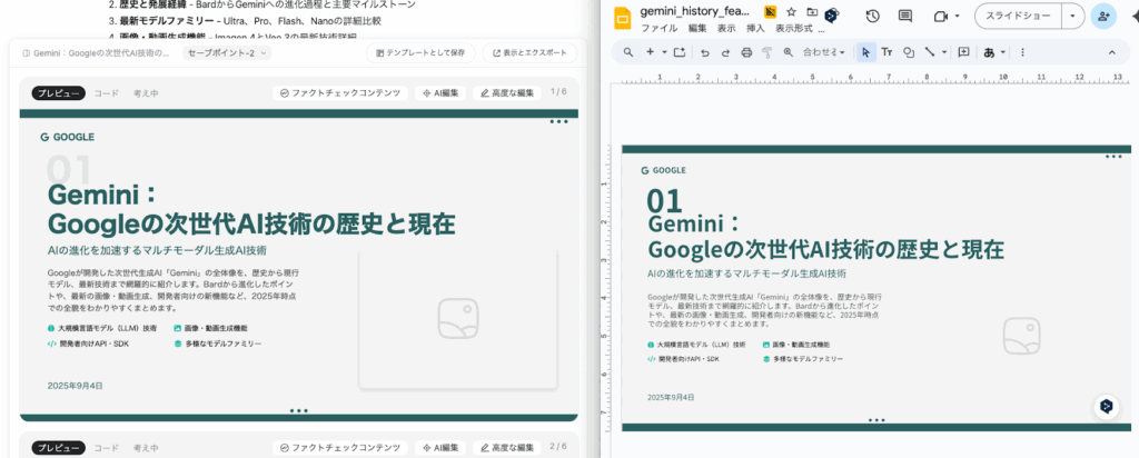 念のため、Gensparkのプレビュー画面(左)と、実際にエクスポートされたGoogleスライドの画面(右)を並べて比較してみました。