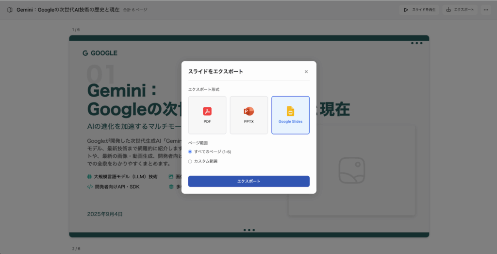 ここからが今回のアップデートのハイライトです。画面上部の「エクスポート」ボタンを押し、書き出し形式として「Google Slides」を選択します。