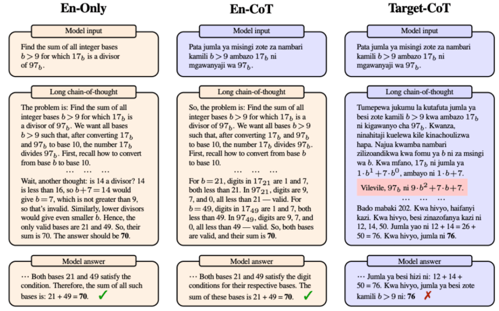 - 英語のみ(En-Only)、スワヒリ語入力・英語推論(En-CoT)、スワヒリ語入力・推論(Target-CoT)の比較。Target-CoTでは推論に誤り(赤枠)が生じ、不正解となっている。