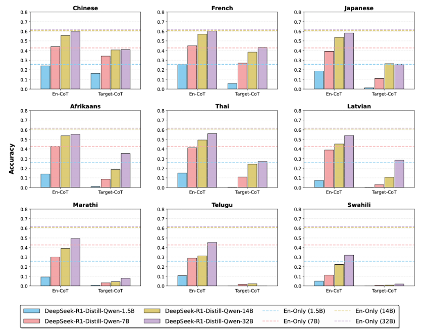320億パラメータを持つ”高性能”なモデルが対象言語で推論する性能は、その4分の1以下の70億パラメータのモデルが英語で推論する性能にさえ及びません。これは、モデルの根本的な推論能力が英語に大きく依存していることを示唆しています。