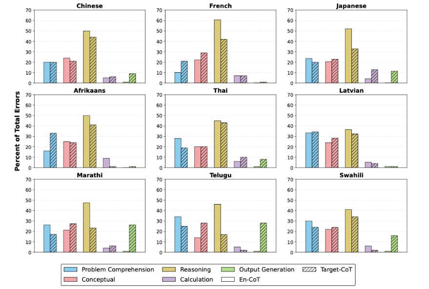 - エラータイプの分析。英語推論(En-CoT、白色の棒)では「Reasoning(推論)」の誤りが大半を占めるが、対象言語での推論(Target-CoT、網掛けの棒)では「Output Generation(出力生成)」や「Conceptual(概念理解)」のエラーが増加している。