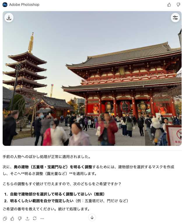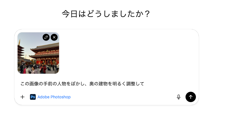 早速、ChatGPTに画像をアップし、「Abobe Photoshop」を選択し、「この画像の手前の人物をぼかし、奥の建物を明るく調整して」と指示してみましょう。