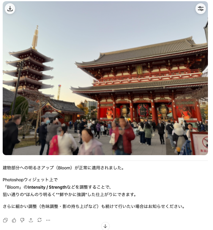 ChatGPTが適切に範囲を選択し、露光量・ハイライト調整を自然に行ってくれました。何気ないiPhoneで撮った写真が一瞬で「使える写真」に生まれ変わる体験は、何度触っても驚きます。
