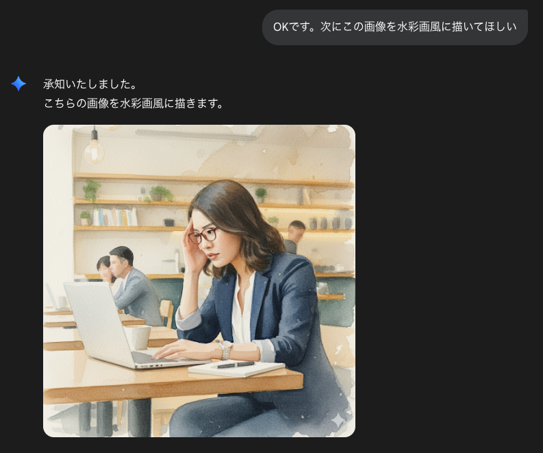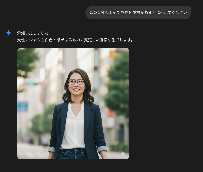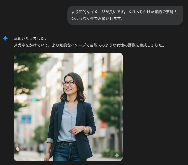 顔の他のパーツや服装、背景は一切崩さず、本当にメガネだけを自然に追加してくれました。従来のAIでは、この時点で全くの別人になってしまうことがほとんどでした。