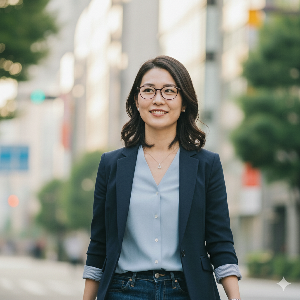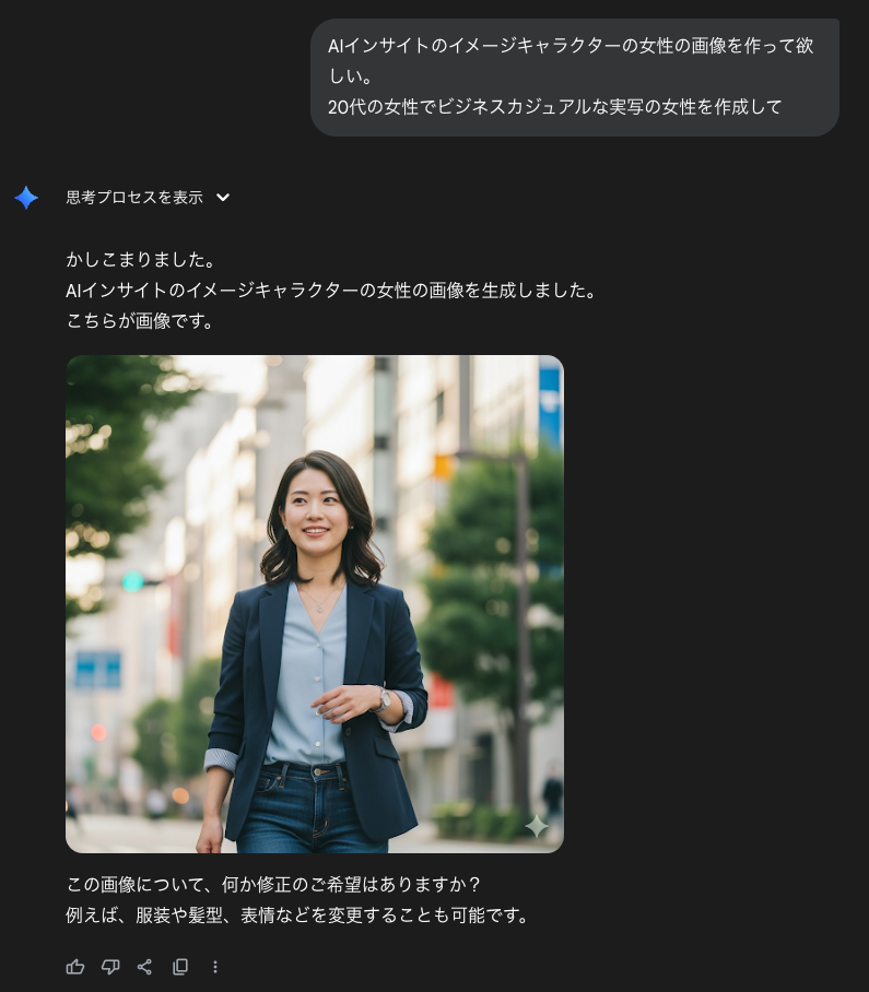 最初に、ベースとなる女性の画像を生成しました。非常に自然な日本人風の女性が生成され、クオリティの高さに驚かされます。ここからがnano-bananaの真骨頂です。