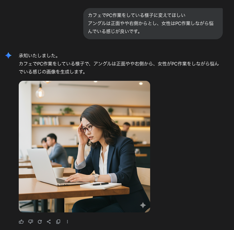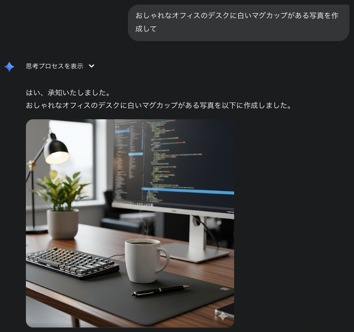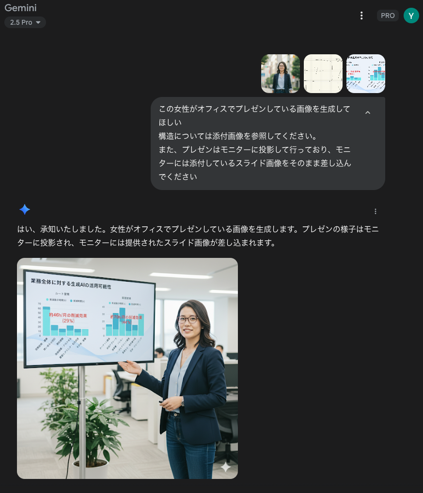 特に注目すべきは、モニターに映し出されたスライドです。日本語のテキストやグラフが一切崩れることなく、高精細に再現されています。これは、Geminiの高度な言語・画像認識能力の賜物であり、ビジネス資料の作成において絶大な威力を発揮します。