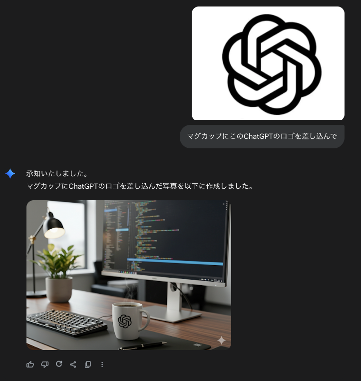 自然言語の指示だけで、これほど精密なインペインティング(部分修正・描画)が可能です。ECサイトの商品写真に名入れをしたり、広告ビジュアルにブランドロゴを追加したりといった作業が、数秒で完了します。