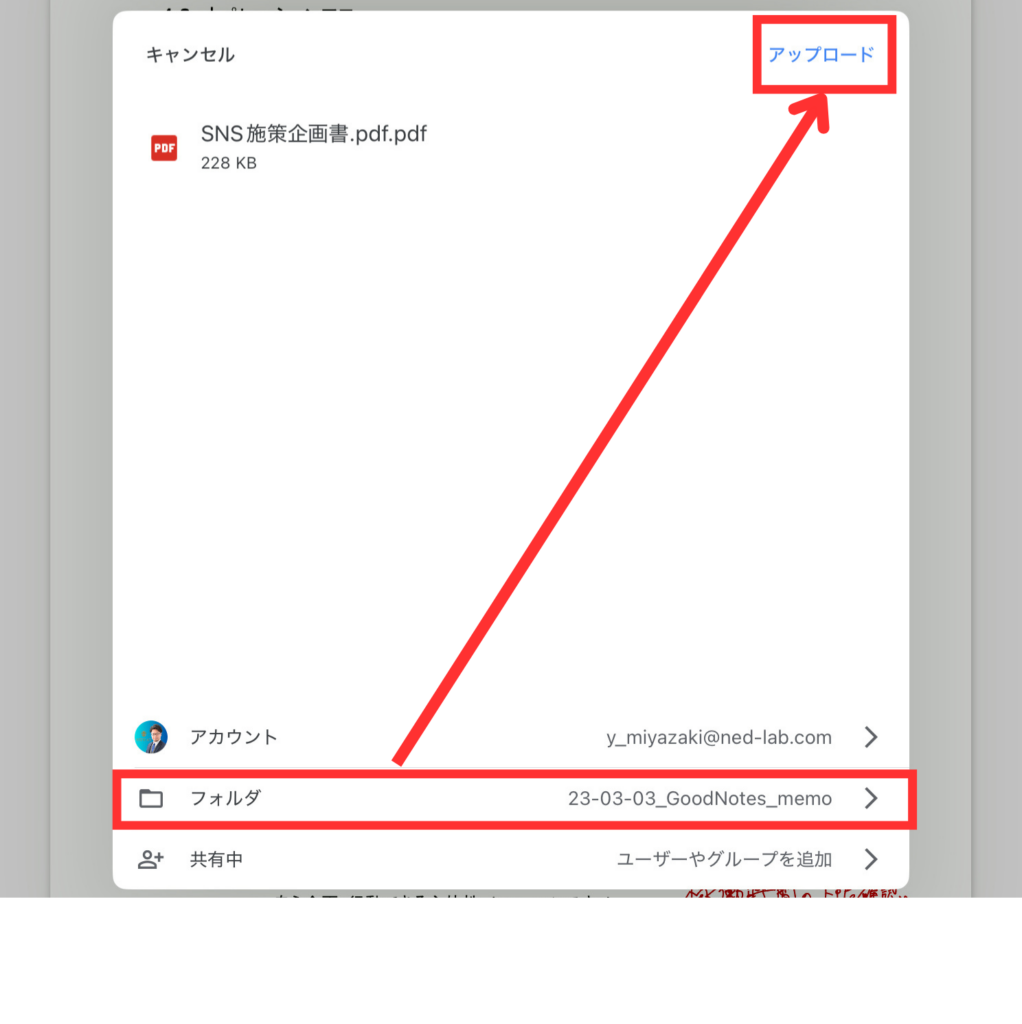 GoogleDrive選択後、保存先のフォルダ選択画面が現れますので、アカウントを確認した上で該当フォルダを選んでください。