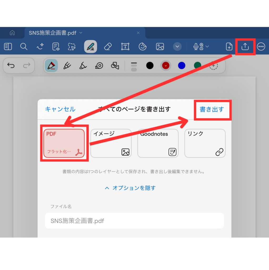まず、GoodNotesの左上の「書き出し」機能からpdfで書き出してください。