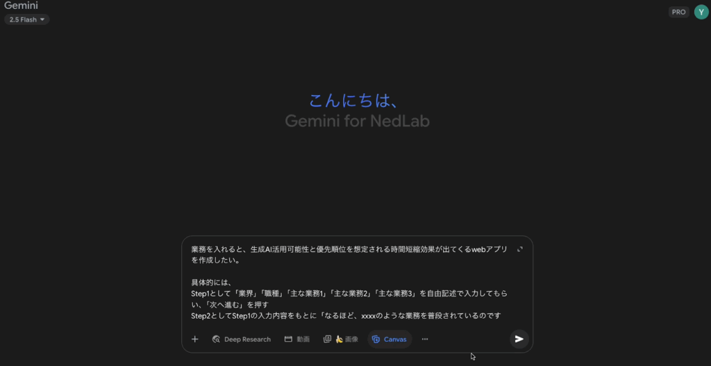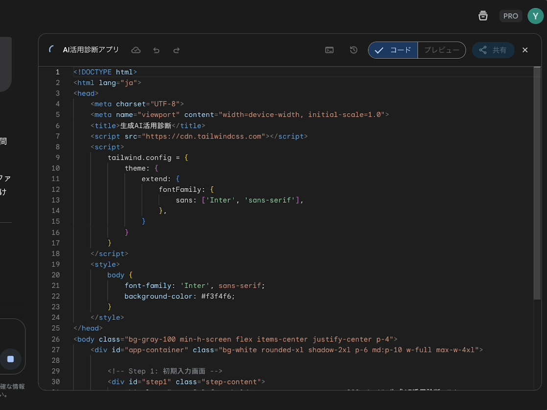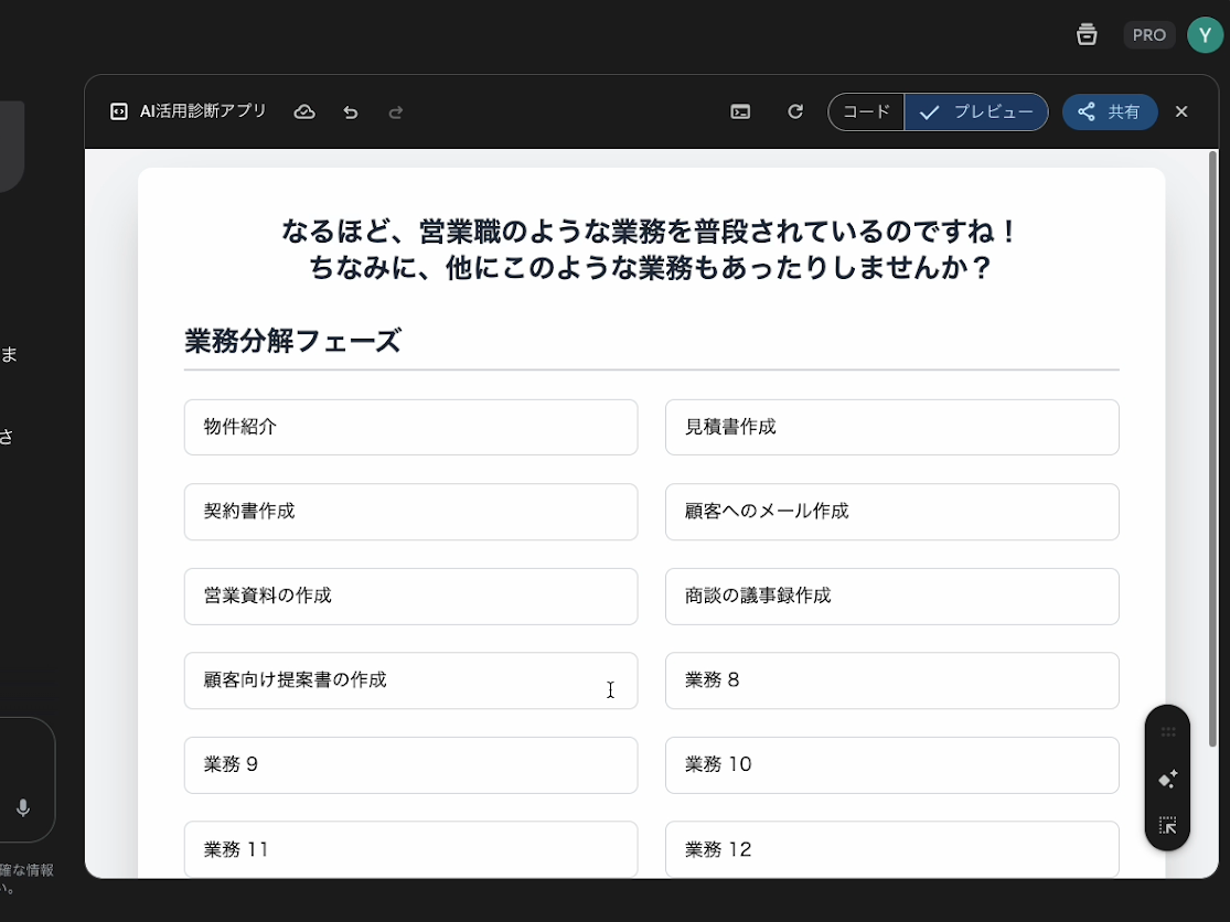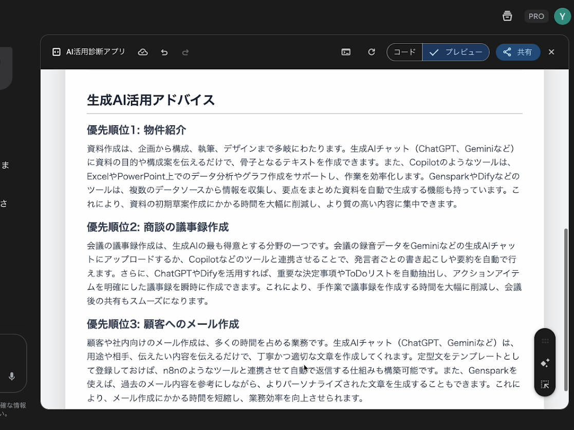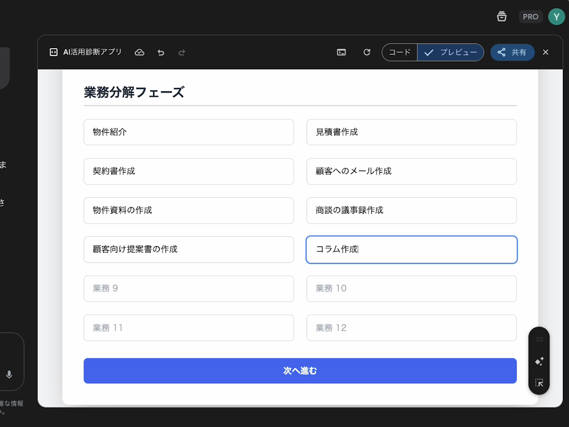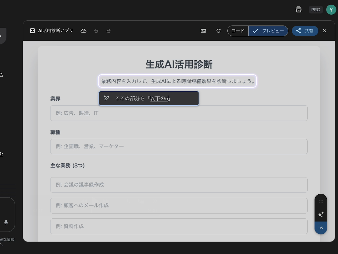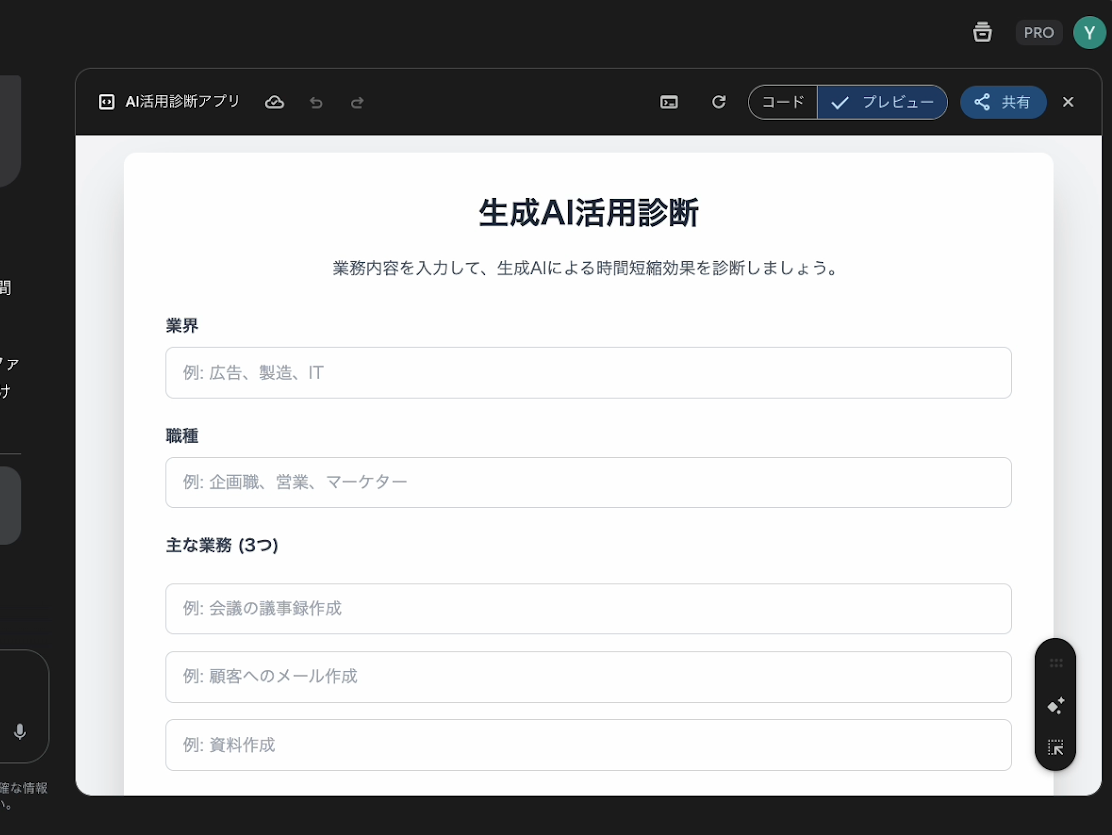 まず、「入力された業務内容から、生成AIで時間短縮できそうな作業を診断するWebアプリ」という、かなり具体的な多段階のアプリケーションを非常に長いプロンプトで依頼しました。