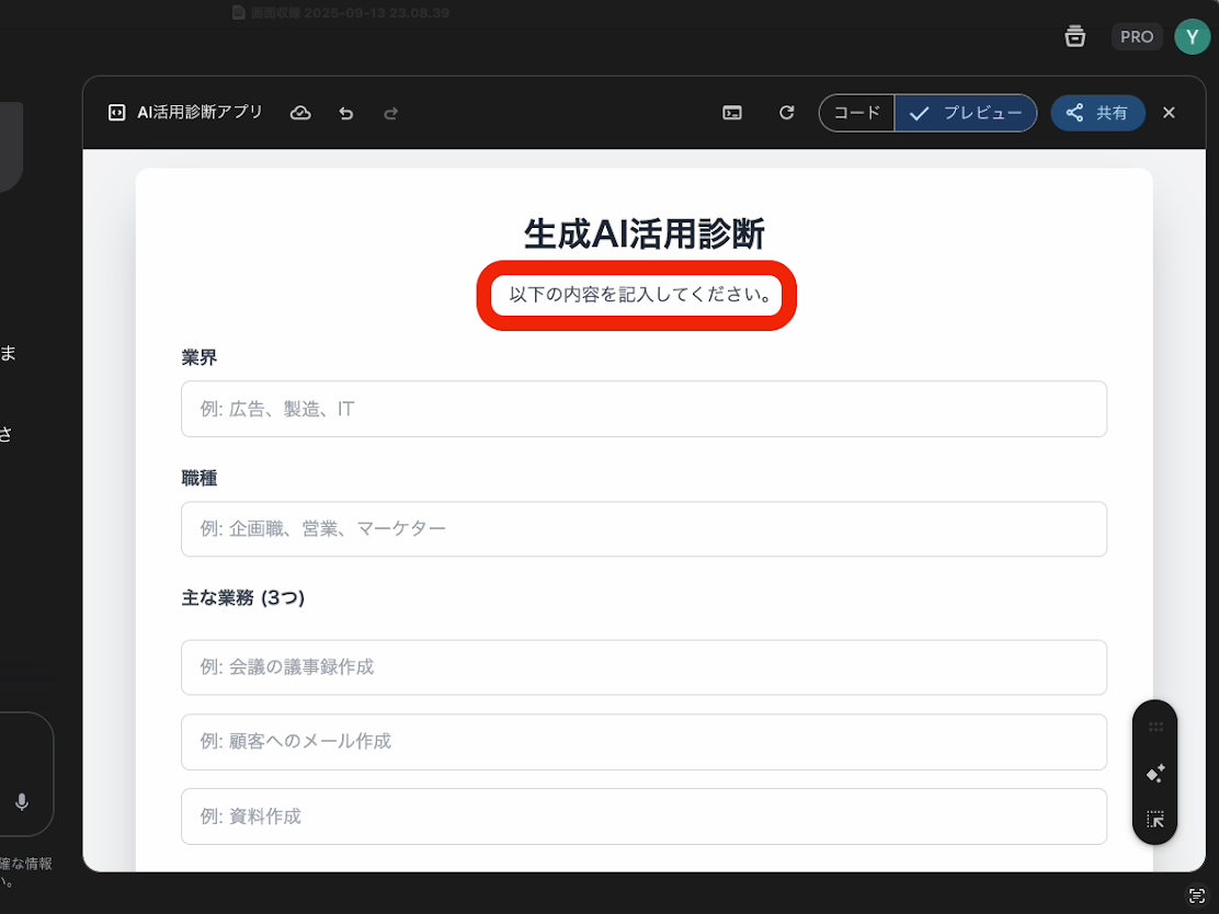 生成されたアプリのプレビューを確認すると、入力フォームの案内文が少し長かったので修正することに。 ここからが今回のアップデートの真骨頂です。
