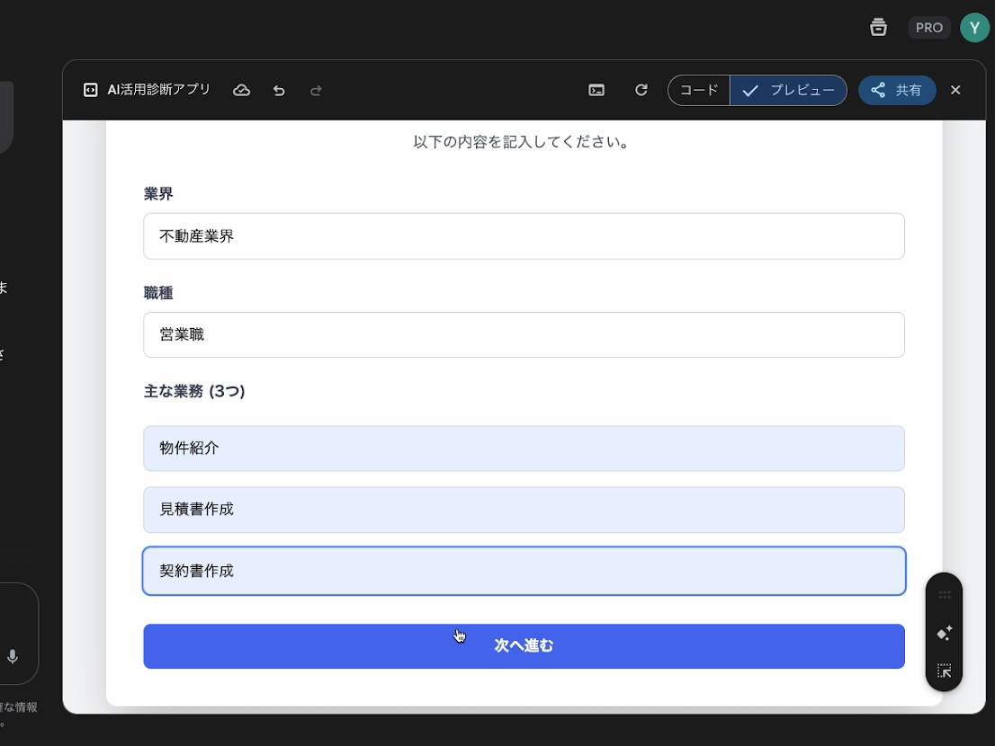 完成した「生成AI活用診断アプリ」を実際に動かしてみます。 まず、業界・職種・主な業務を入力します。