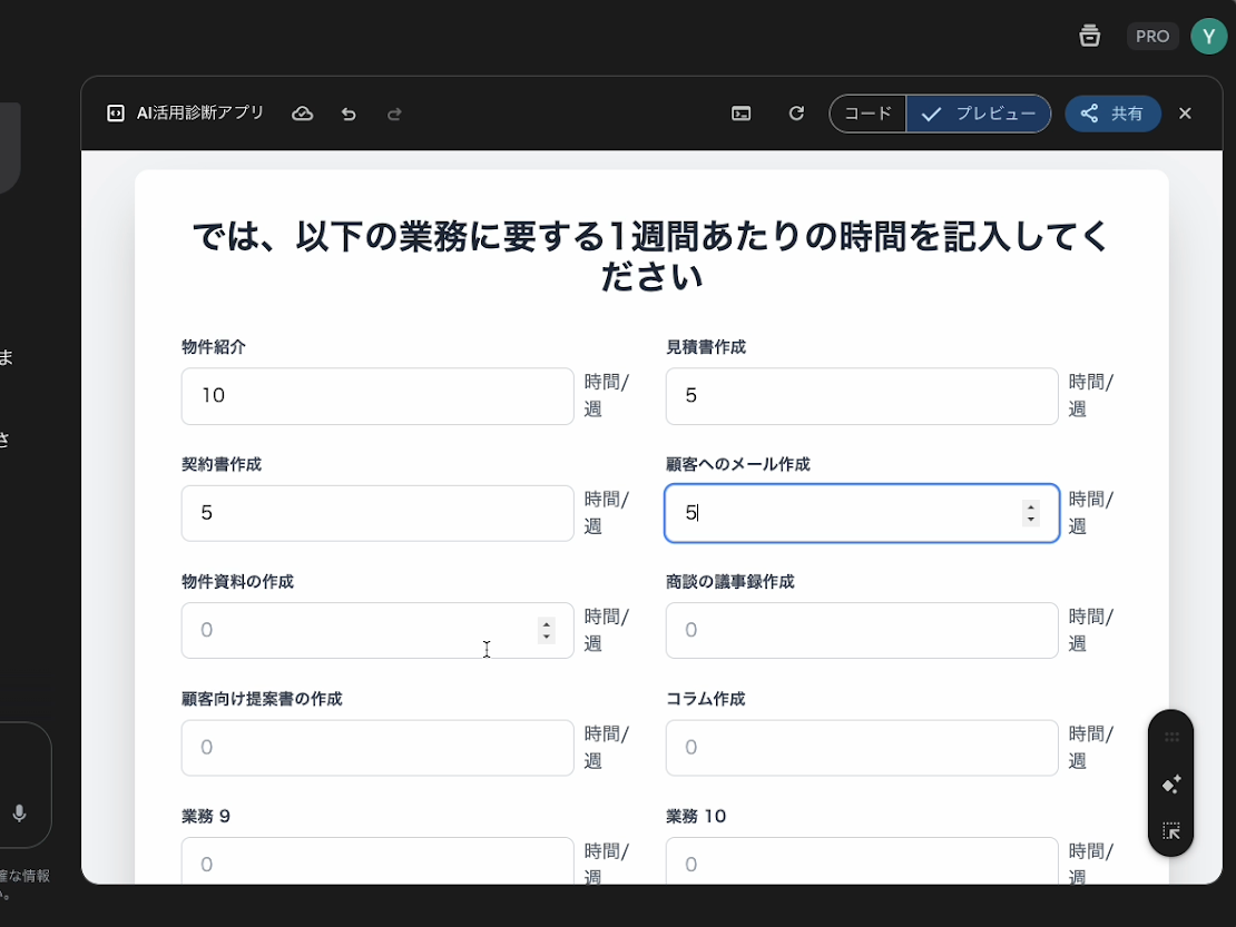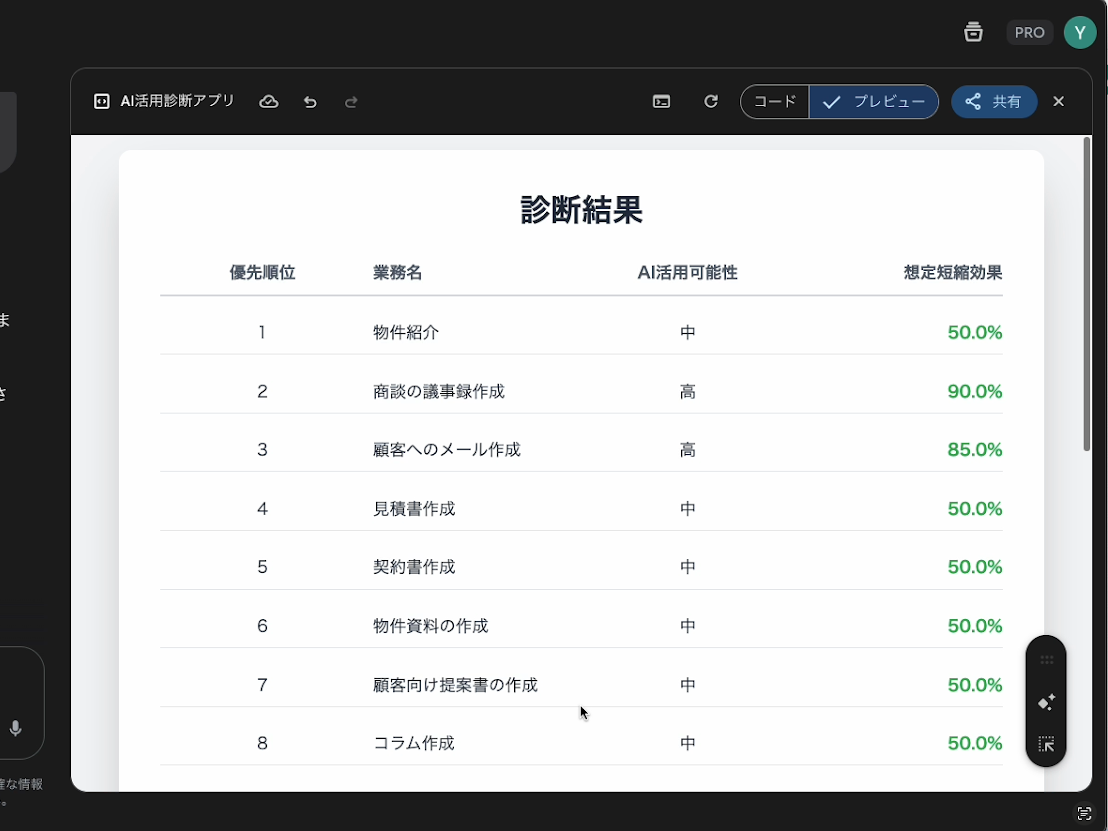 生成AI活用による時間短縮効果の診断結果が表示される、という本格的なアプリケーションが、本当にチャットだけで完成してしまいました。