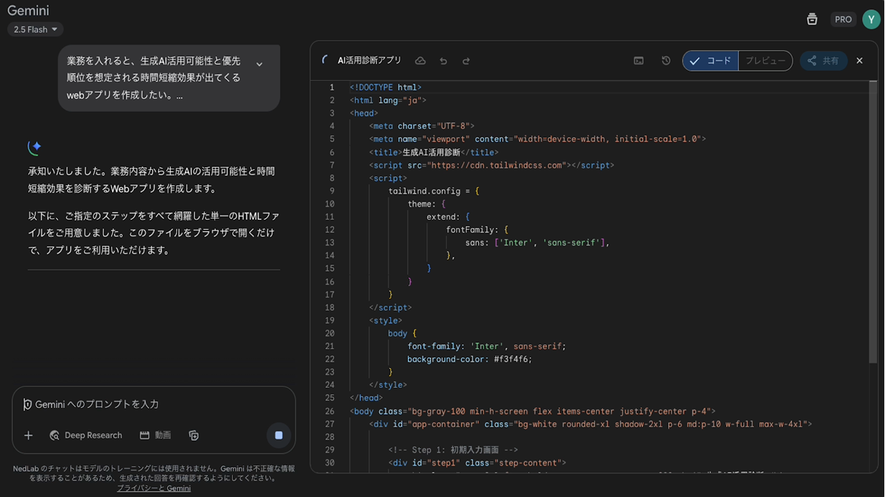 まず、「入力された業務内容から、生成AIで時間短縮できそうな作業を診断するWebアプリ」という、かなり具体的な多段階のアプリケーションを非常に長いプロンプトで依頼しました。