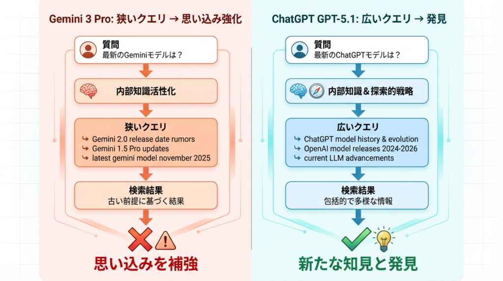 これは生成AIの検索戦略における確証バイアス(Confirmation Bias)の一種と考えられており、Geminiは内部知識が正しいと「思い込んで」おり、その前提を検証する検索を行うが、前提が古い場合、最新情報を見逃してしまうのです。