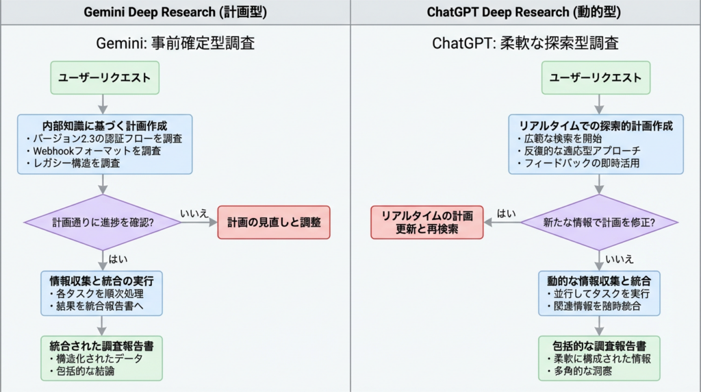 対照的に、ChatGPT Deep Researchは動的な調査プロセスを採用。検索結果を分析しながらリアルタイムで次の検索を決定し、予期せぬ発見にも柔軟に対応します。