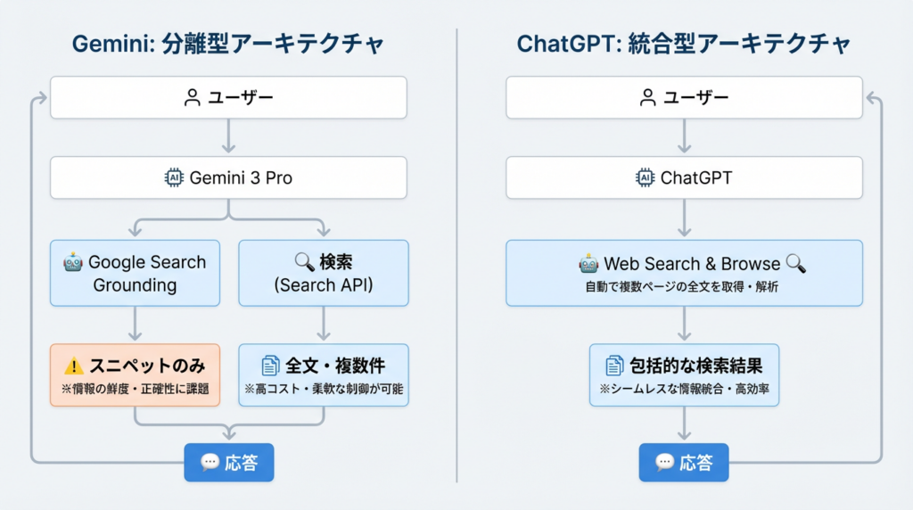 つまり、Gemini 3 Proの検索機能は「分離型アーキテクチャ」で、モデルが検索結果のページを自律的に全文読解する仕組みが存在していません。