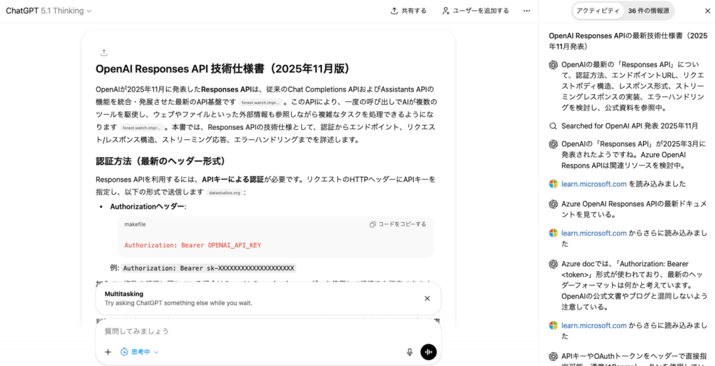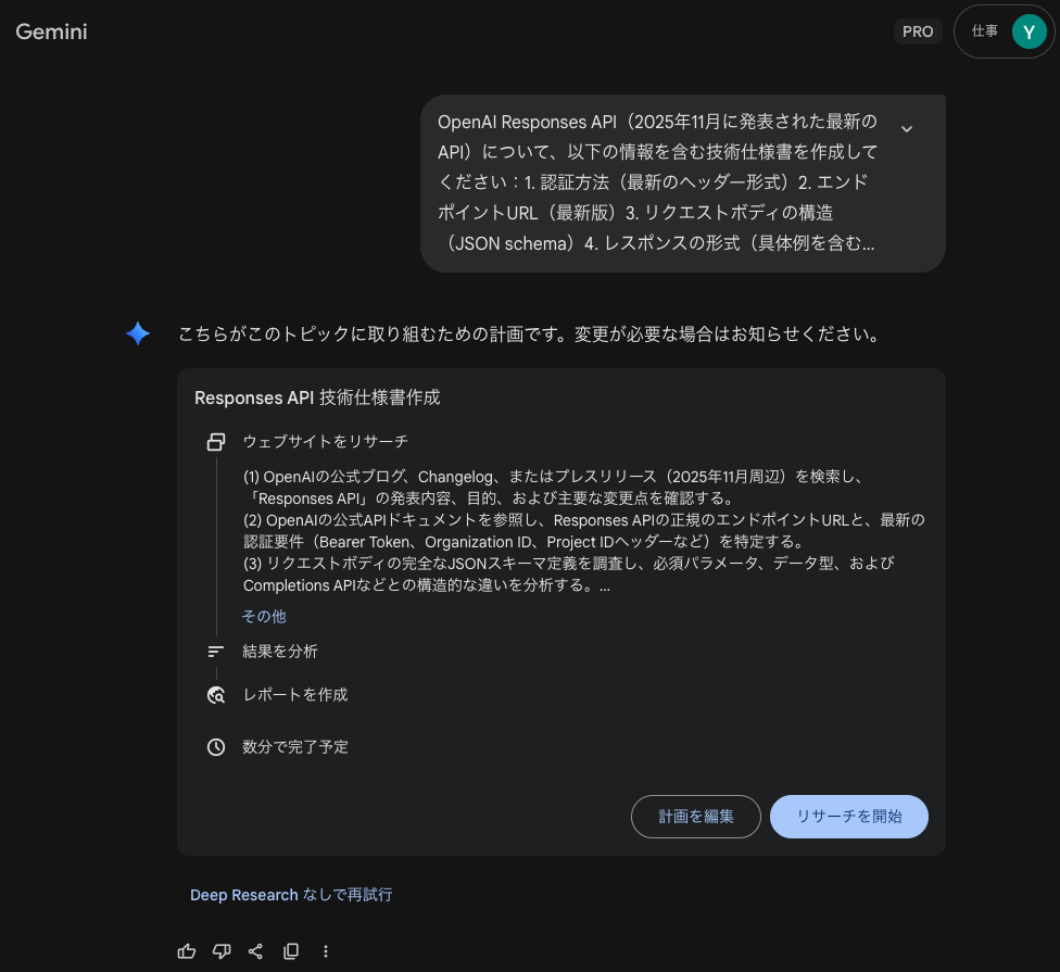 手順: Gemini 3 ProとChatGPT5.1に「OpenAI Responses API(2025年11月発表)の技術仕様書を作成してください」と依頼。