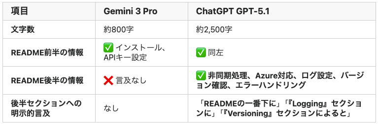 ChatGPTは「READMEの一番下に要件が書いてあります」「READMEの『Logging』セクションに書かれている」など、README後半の具体的なセクション名を明記。Geminiにはこれらの言及が一切ありませんでした。