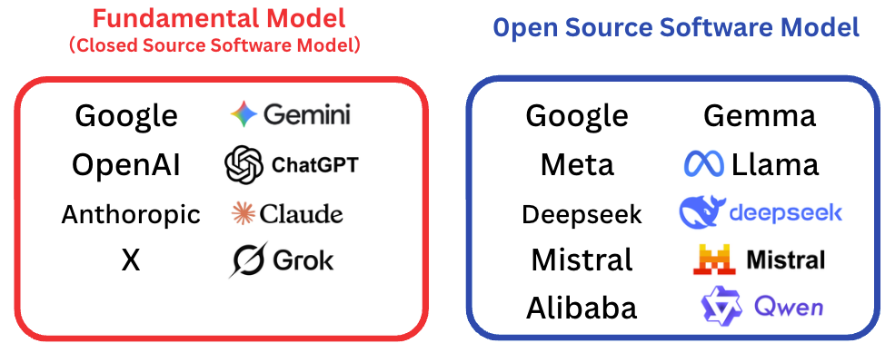 AI業界では現在ファンダメンタルモデルを有するOpenAIやGoogle、Anthoropicがサービス競争を行なっているのに対して、オープンソースモデルを有する企業ではモデル競争という2つの軸で競争が進んでいると見ることができます。