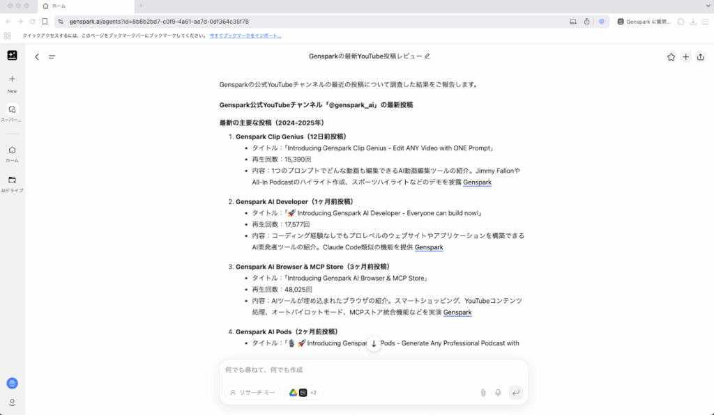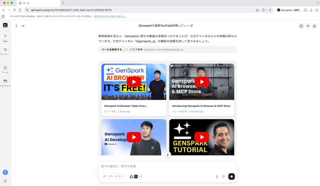 トップ画面の「スーパーエージェント」に、今回は「Gensparkの公式Youtubeチャンネルについて教えて」と質問してみました。