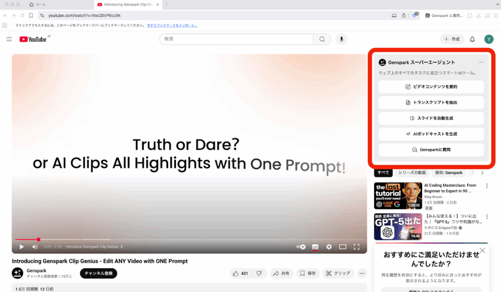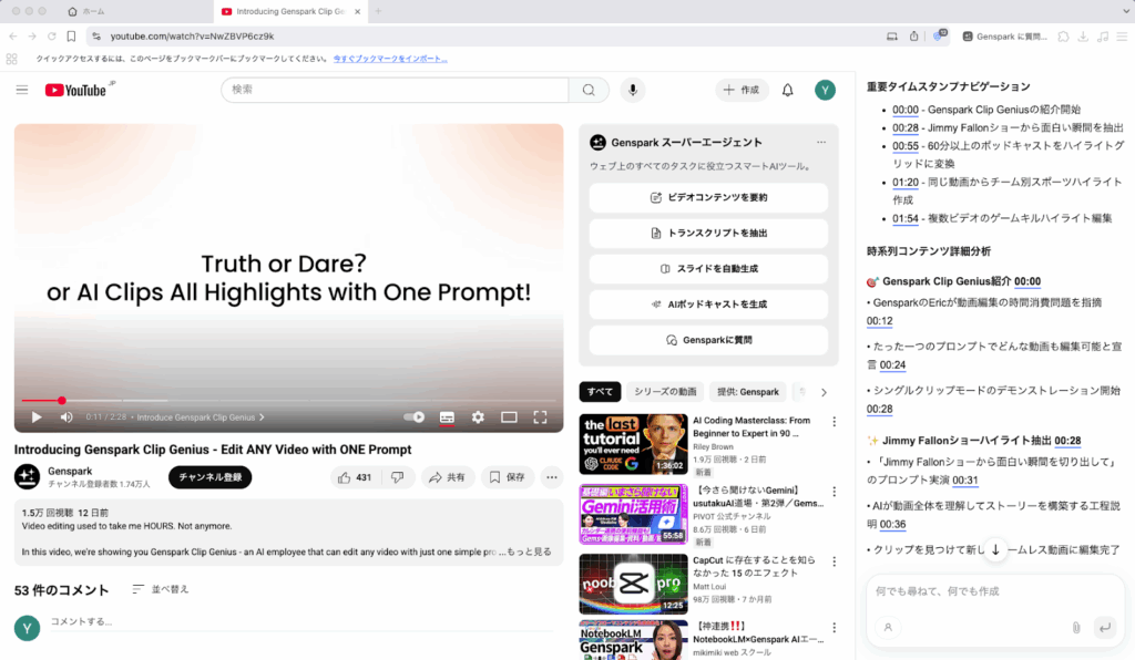 ここからがGenspark AIブラウザの真骨頂です。画面右側に、現在のページ(YouTube)の文脈を理解したスーパーエージェントの操作パネルが自動で表示されます。 今回は「ビデオコンテンツの要約」というボタンが表示されたので、これを押してみます。