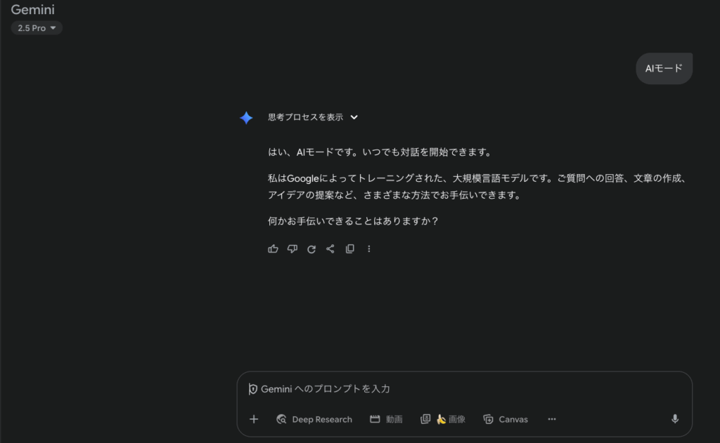 同じ質問を対話AIのGeminiにしてみると、より会話的なトーンで、自身の機能について説明してくれました。今回は「GoogleのAIモードについて知りたい」が目的でしたがプロンプトが短すぎてGeminiは少しズレた回答をしています。 所感として、ウェブ上の情報を素早く要約して欲しい「調べ物」のようなライトな質問はAIモードの方が欲しい情報に早くたどり着ける印象です。