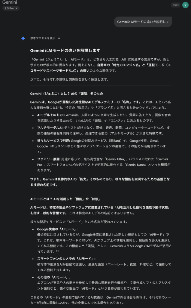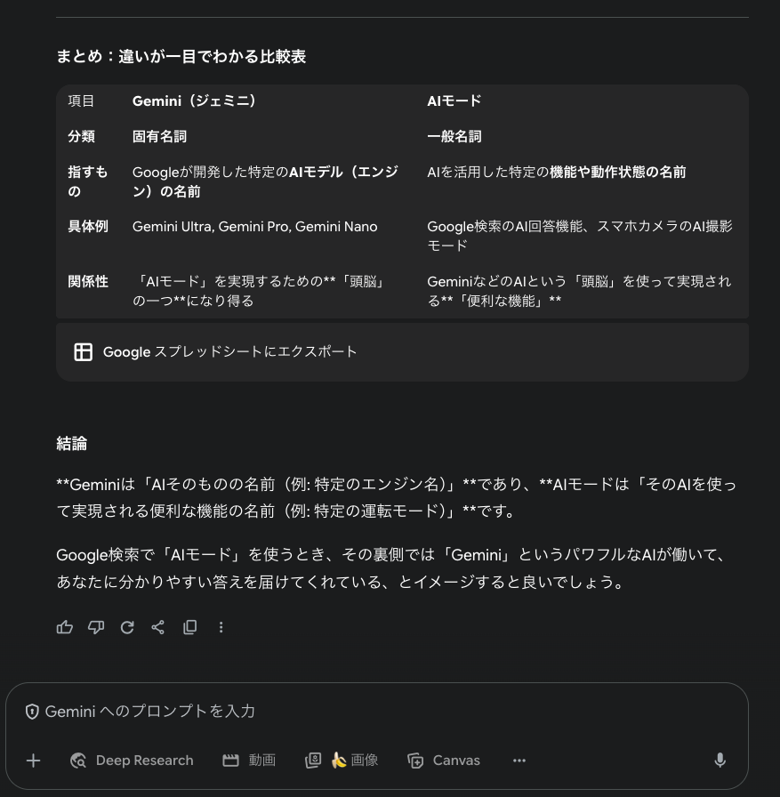 最後に、AIモードとGemini自身に、両者の違いを説明してもらいました。 両者の回答を要約すると、