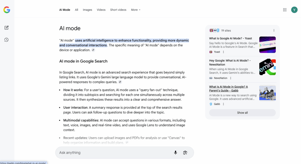 「What is AI Mode in Google Search」と検索すると、AIモードがその機能について、ウェブ上の情報を基に分かりやすくまとめてくれました。右側には参考にしたサイトへのリンクが表示されています。
