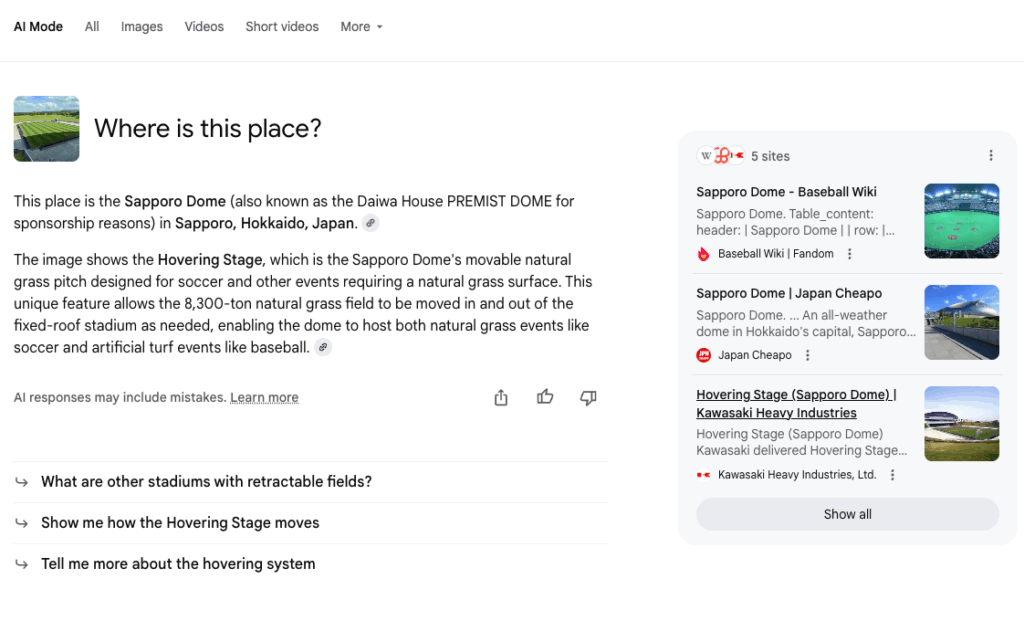 次に、札幌ドームの写真をAIモードにアップロードし、「Where is this place?」と場所を尋ねてみました。特徴が少ない空撮写真にもかかわらず、「Sapporo Dome」と正確に特定し、その特徴である「ホヴァリングステージ」についてまで詳しく解説してくれました。