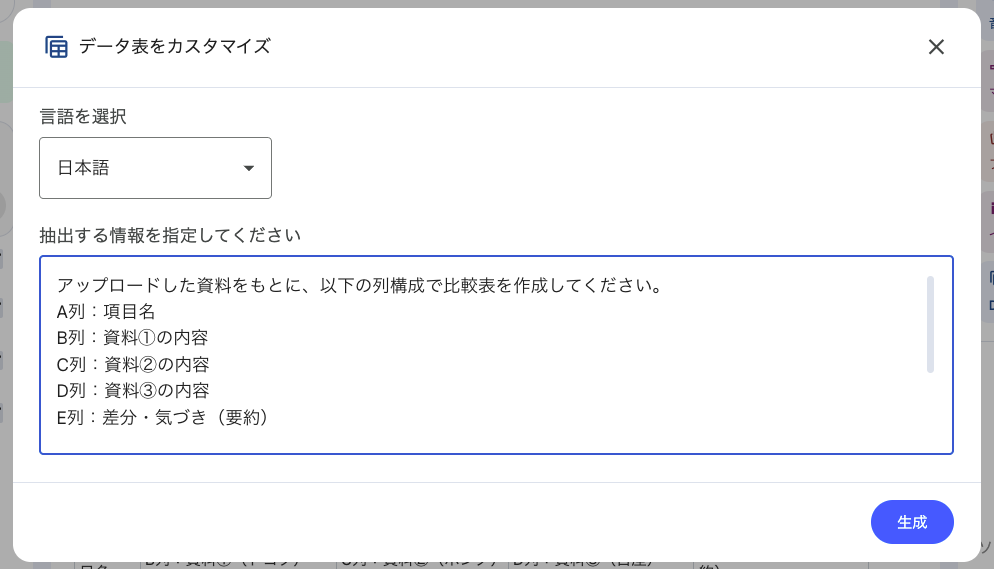 - Studioで「比較表」「数値抽出表」を生成