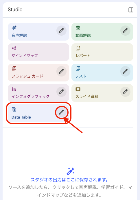 ソースを読み込ませた後、画面右側の「Studio」パネルが本領を発揮します。これは、ソース群を「材料」として、NotebookLMに新しい形のコンテンツを生成させる機能です。