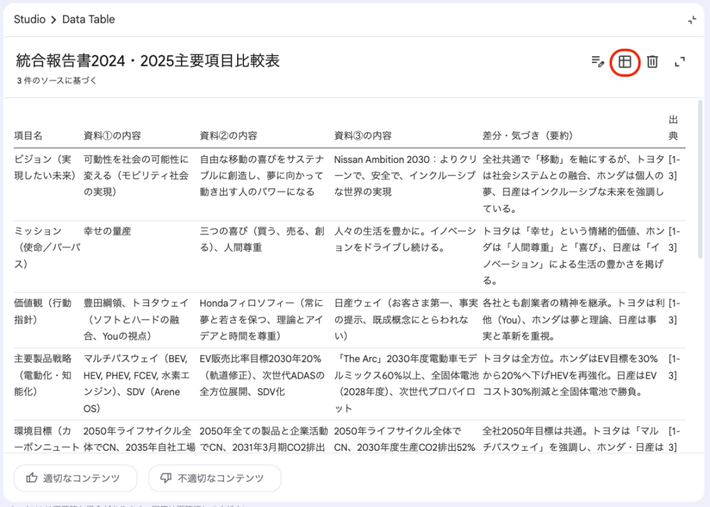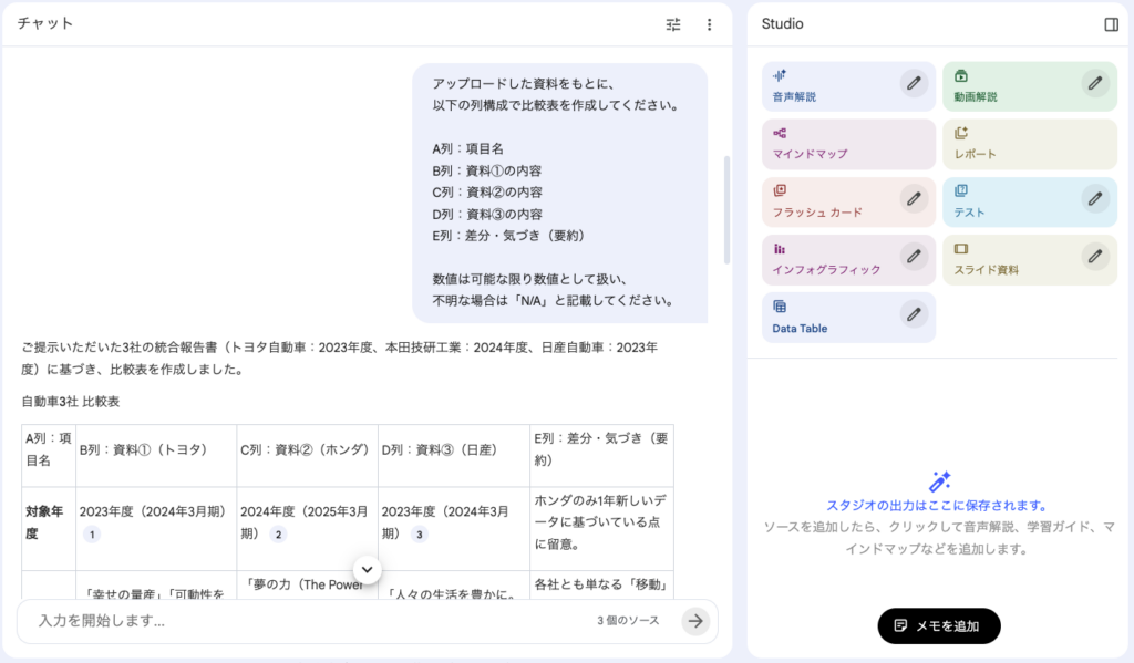 自動車業界3社の統合報告書が入ったNotebookLMに対して、まずはChat上で比較資料を作成させます。今まではこれをコピーする必要がありました。