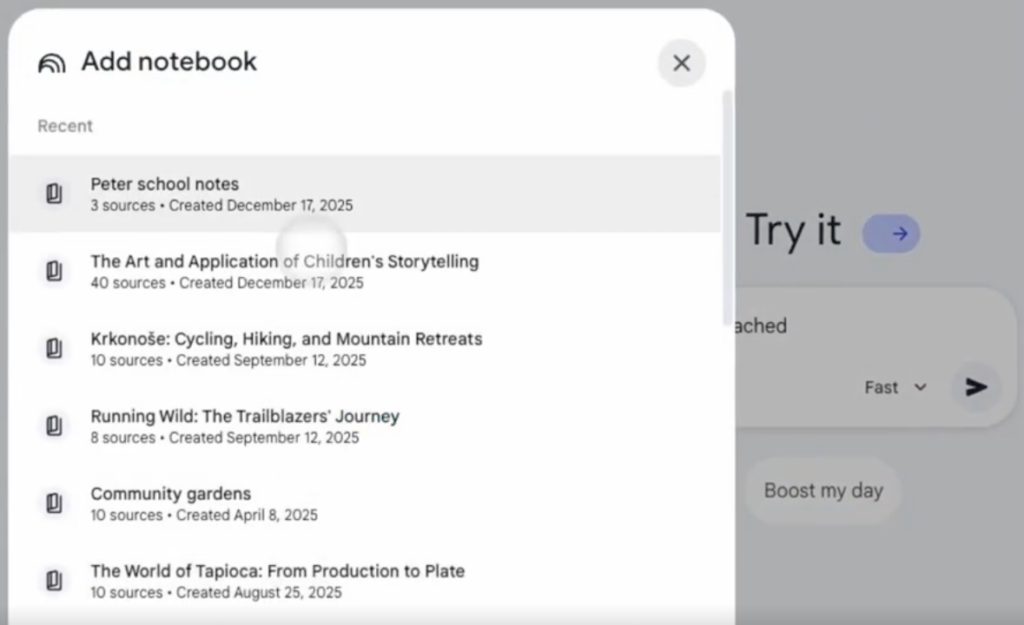 Geminiのツール一覧にNotebookLMが表示されるようになりました。